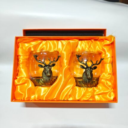 A premium gift set of two whiskey tumblers, each adorned with a detailed, antique-finish stag head at the base. Presented