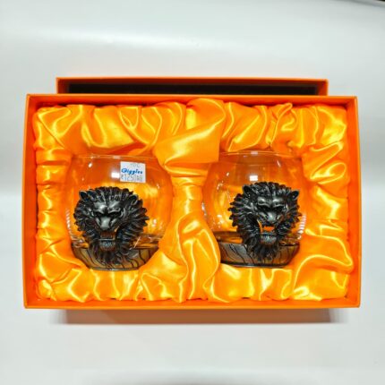 A set of two distinctive whiskey glasses, each featuring a bold, sculpted lion head base in an antique gunmetal finish.