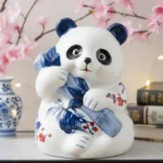 This lovable panda is beautifully crafted with classic black and white features, holding a bundle of blue bamboo. Delicate red floral accents add a touch of color and artistry. Whether used as a money bank for a child’s room or as a delightful figurine on a shelf, this piece is sure to bring a smile.
