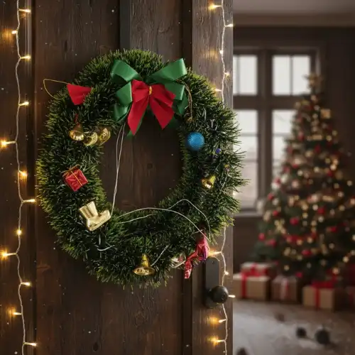 A lush green artificial wreath generously decorated with ribbons, bells, and ornaments. Hang it on your front door to extend a warm, festive welcome to all your holiday guests.