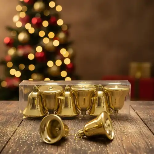 A classic set of shiny golden bell ornaments, perfect for decorating your Christmas tree, wreaths, or garlands. These bells add a traditional touch and a cheerful jingle to your holiday festivities.