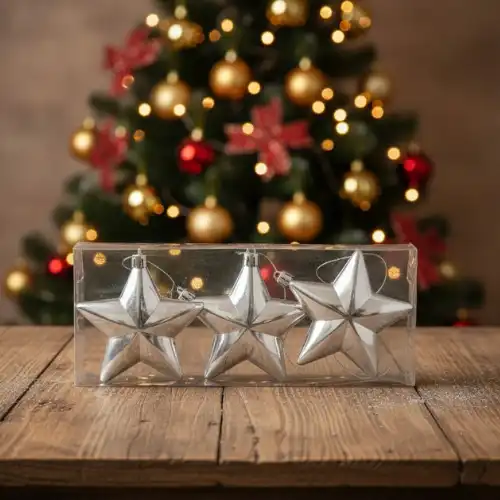 A set of three elegant, reflective silver star ornaments. These classic five-pointed stars are perfect for adding a bright, celestial shimmer to your Christmas tree.