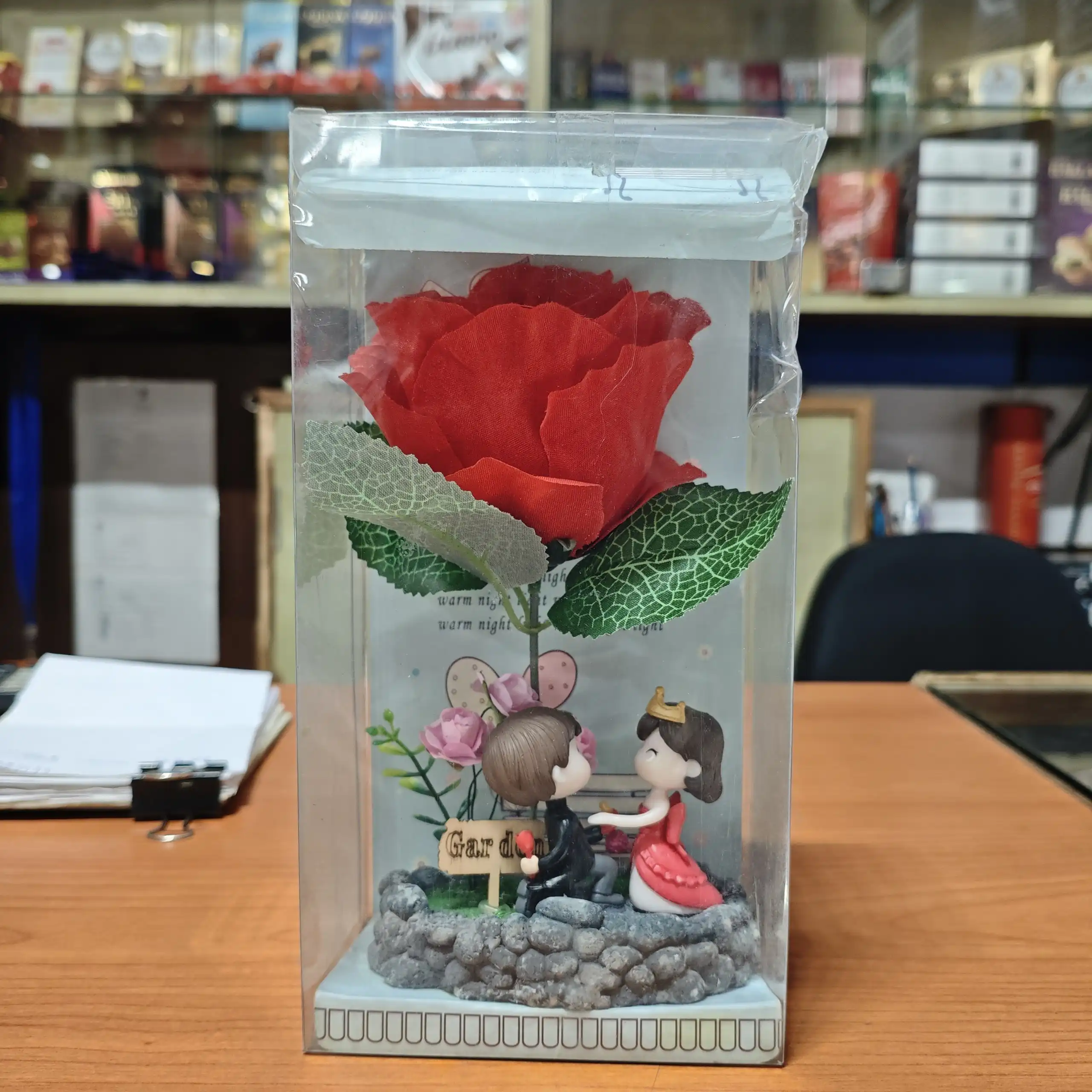 A poetic gift that captures the essence of a romantic stroll. This display box features a giant red velvet rose looming over a miniature garden scene with a couple. It is an artistic representation of grand love within a small, precious space.